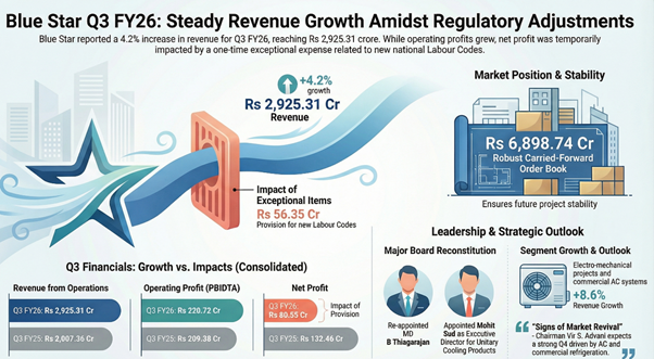 Blue Star Ltd (NSE: BLUESTARCO) reported moderate revenue growth and lower reported profit for the quarter ended December 31, 2025 (Q3 FY26), reflecting steady operating performance and the impact of a one-time exceptional charge related to new labor codes.