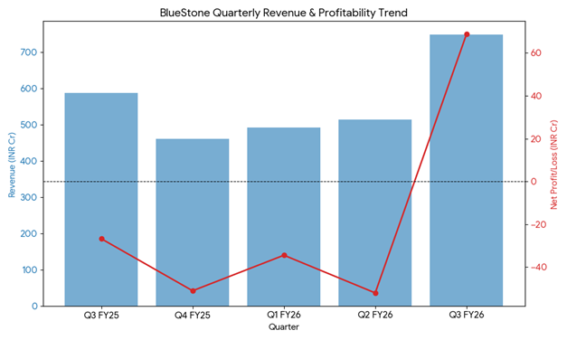 Bluestone posted its first profitable quarter, driven by revenue growth, margin expansion, and operational efficiency. Effective deployment of IPO proceeds and high-performing stores contributed to the turnaround. The company remains positioned to expand its store network while maintaining profitability in its digital-first, omnichannel model.