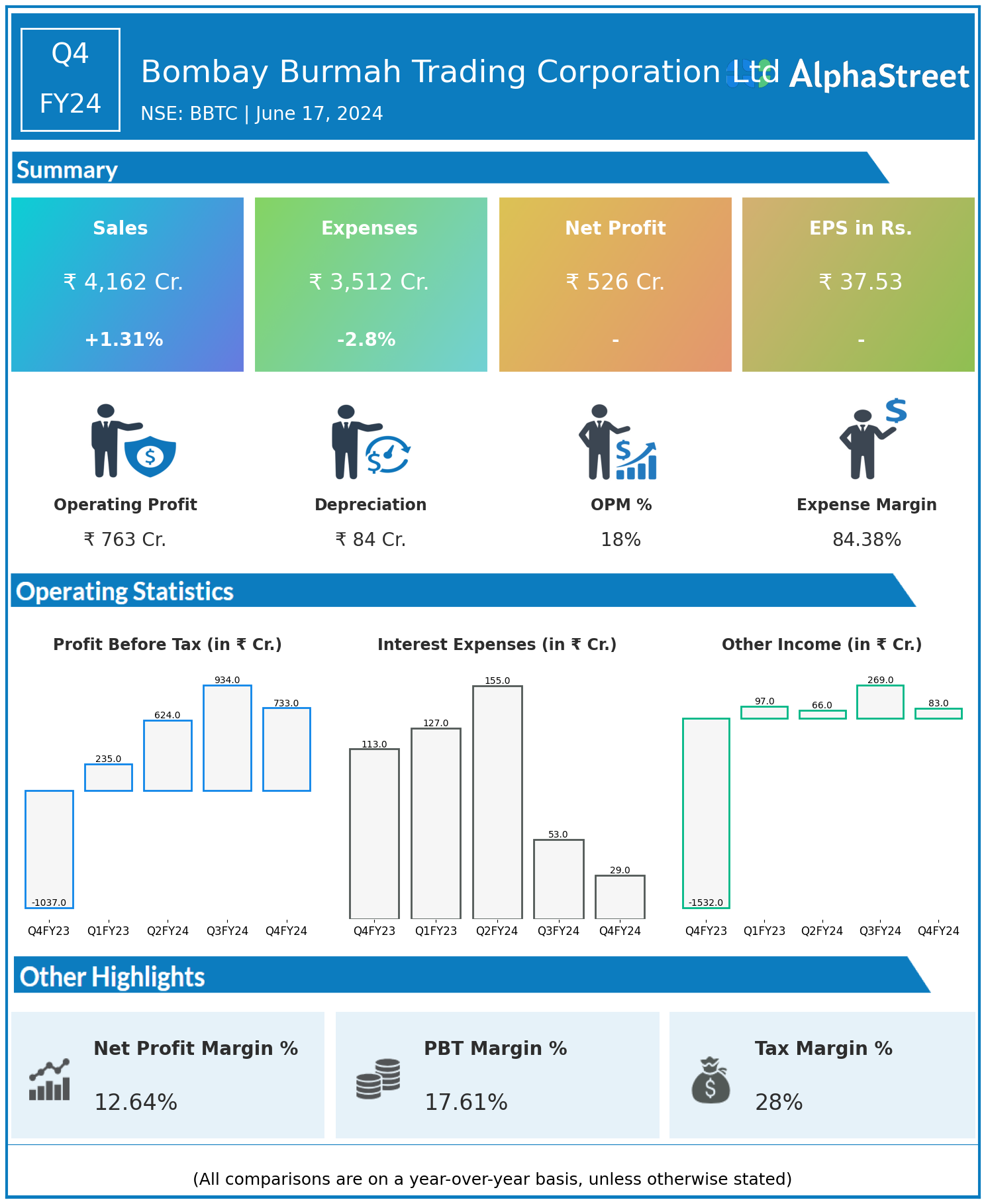 Bombay Burmah Trading Corporation Ltd reported Revenues for Q4FY24 of ₹4,162.00 Crores up from ₹4,108.00 Crore year on year, a rise of 1.31%.