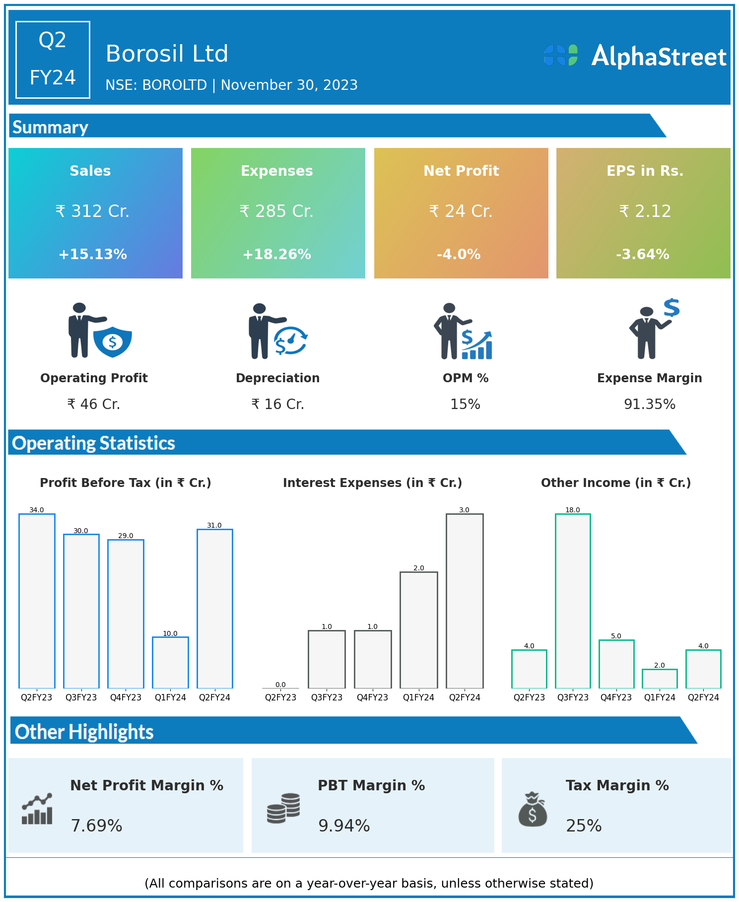 Total Expenses for Q2FY24 of ₹285.00 Crores up from ₹241.00 Crores year on year, a rise of 18.26%.