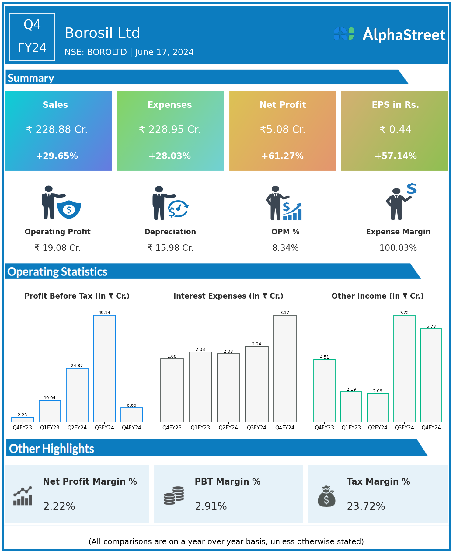 Borosil Ltd reported Revenues for Q4FY24 of ₹228.88 Crores up from ₹176.54 Crore year on year, a rise of 29.65%.