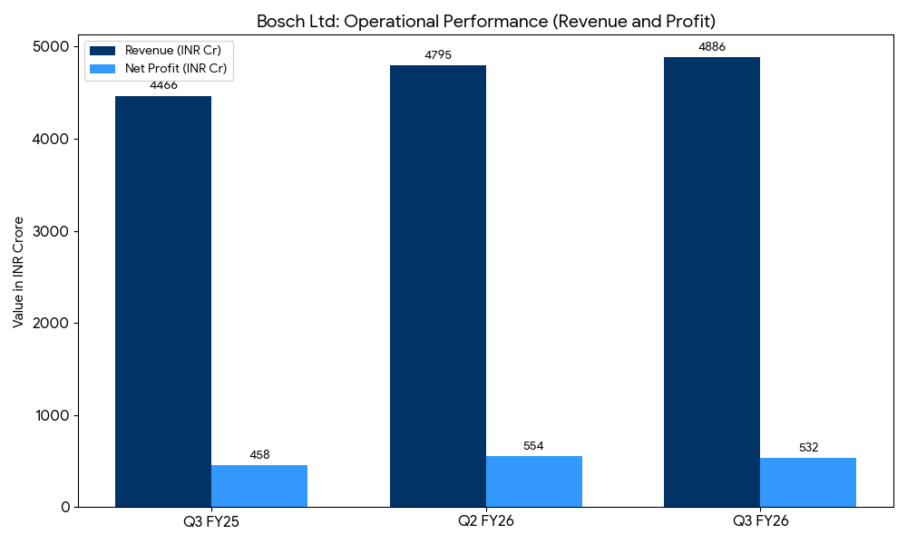 For the third quarter of fiscal year 2026, Bosch Limited reported consolidated revenue from operations of ₹4,886 crore, representing a 9.4% increase from ₹4,466 crore in the same period last year. Consolidated net profit for the quarter rose 16.1% year-over-year to ₹532 crore.