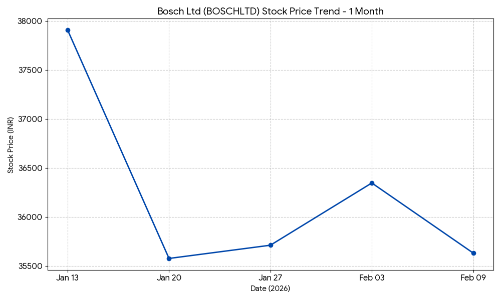 Bosch Limited shares decreased 1.95% to ₹35,630.00 today. Q3 revenue grew 9.4% and net profit increased 16.1%. Automotive and two-wheeler segments reported growth, while the beyond mobility segment contracted following a business divestiture.