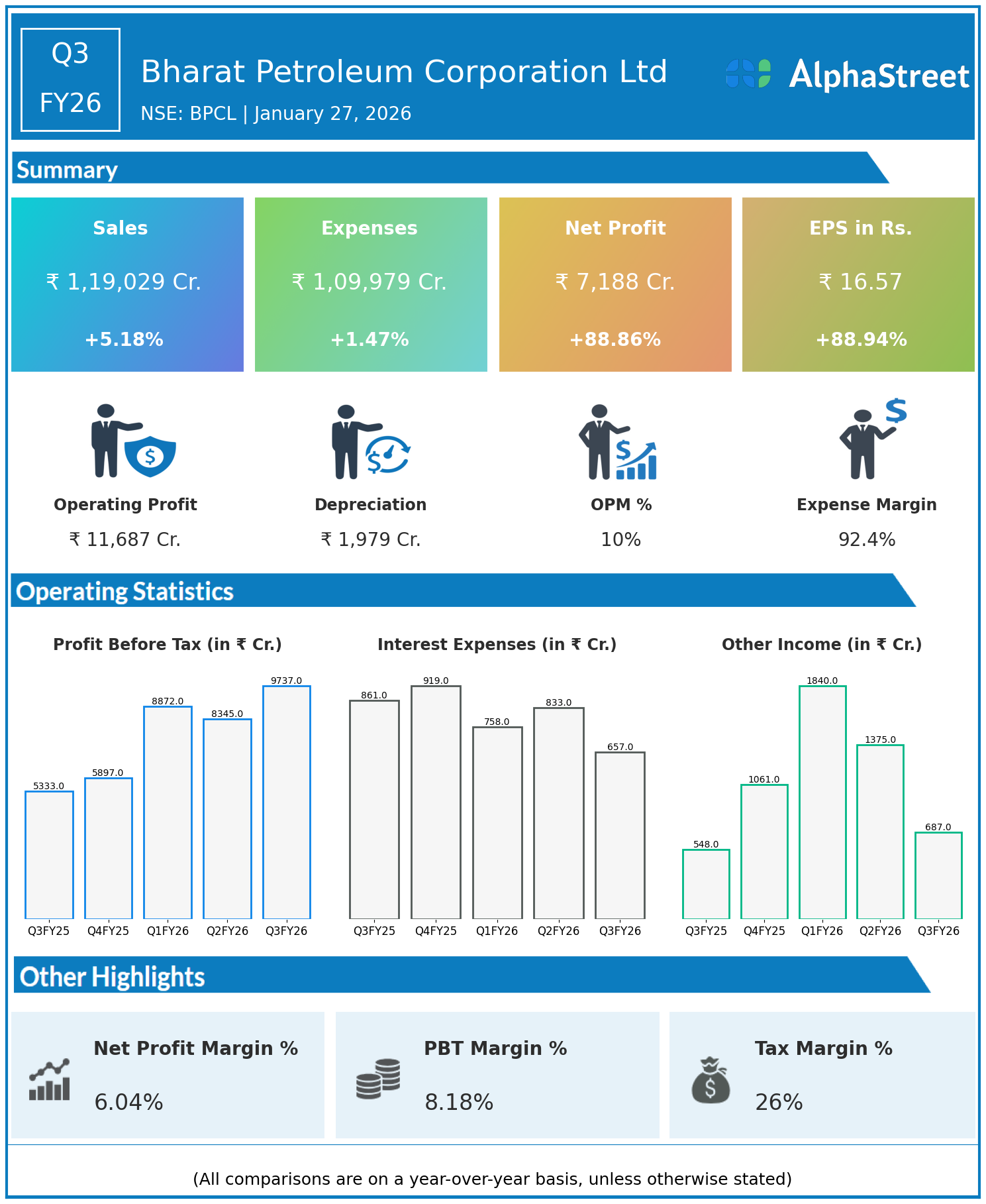 Bharat Petroleum Corporation Ltd (BPCL) reported Q3FY26 revenues of ₹1,19,029 crore, up 5.18% YoY, with consolidated net profit soaring 88.86% to ₹7,188 crore. Total expenses rose 1.47% YoY to ₹1,09,979 crore, enabling strong earnings expansion.