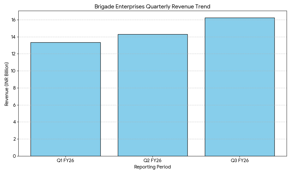 For the third quarter of the 2026 fiscal year (Q3 FY26) ended December 31, 2025, Brigade Enterprises reported consolidated revenue of INR 16.23 billion, a 6% increase compared to INR 15.30 billion in the same period of the prior year. Consolidated profit after tax (PAT) for the quarter was INR 2.06 billion, representing a 13% decline from INR 2.36 billion in Q3 FY25. Earnings before interest, taxes, depreciation, and amortization (EBITDA) stood at INR 4.59 billion, a 4% decrease year-over-year.