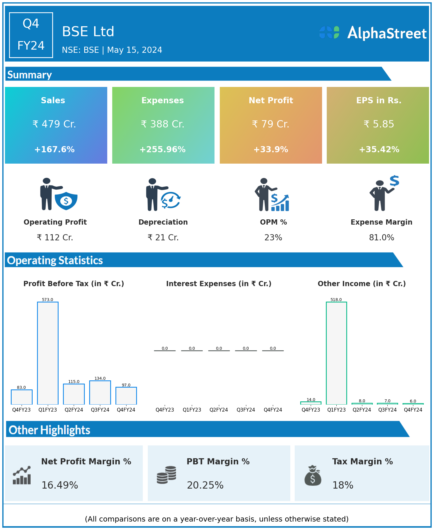 BSE Ltd reported Revenues for Q4FY24 of ₹479.00 Crores up from ₹179.00 Crore year on year, a rise of 167.6%.
