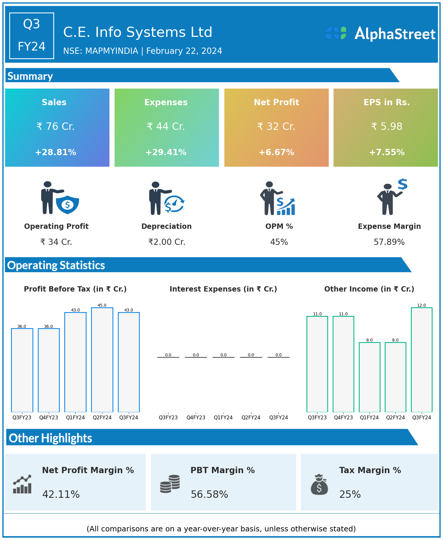 C.E. Info Systems Ltd reported Revenues for Q3FY24 of ₹76.00 Crores up from ₹59.00 Crore year on year, a rise of 28.81%.