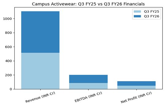 For the full fiscal year 2025, Campus Activewear reported revenue of INR 1,593.0 Cr, a growth of 10.0% over the previous year. Net profit for FY25 was INR 121.3 Cr. For the first nine months of FY26, revenue rose 11.1% to INR 1,318.5 Cr, while net profit increased 23.0% to INR 106.0 Cr.