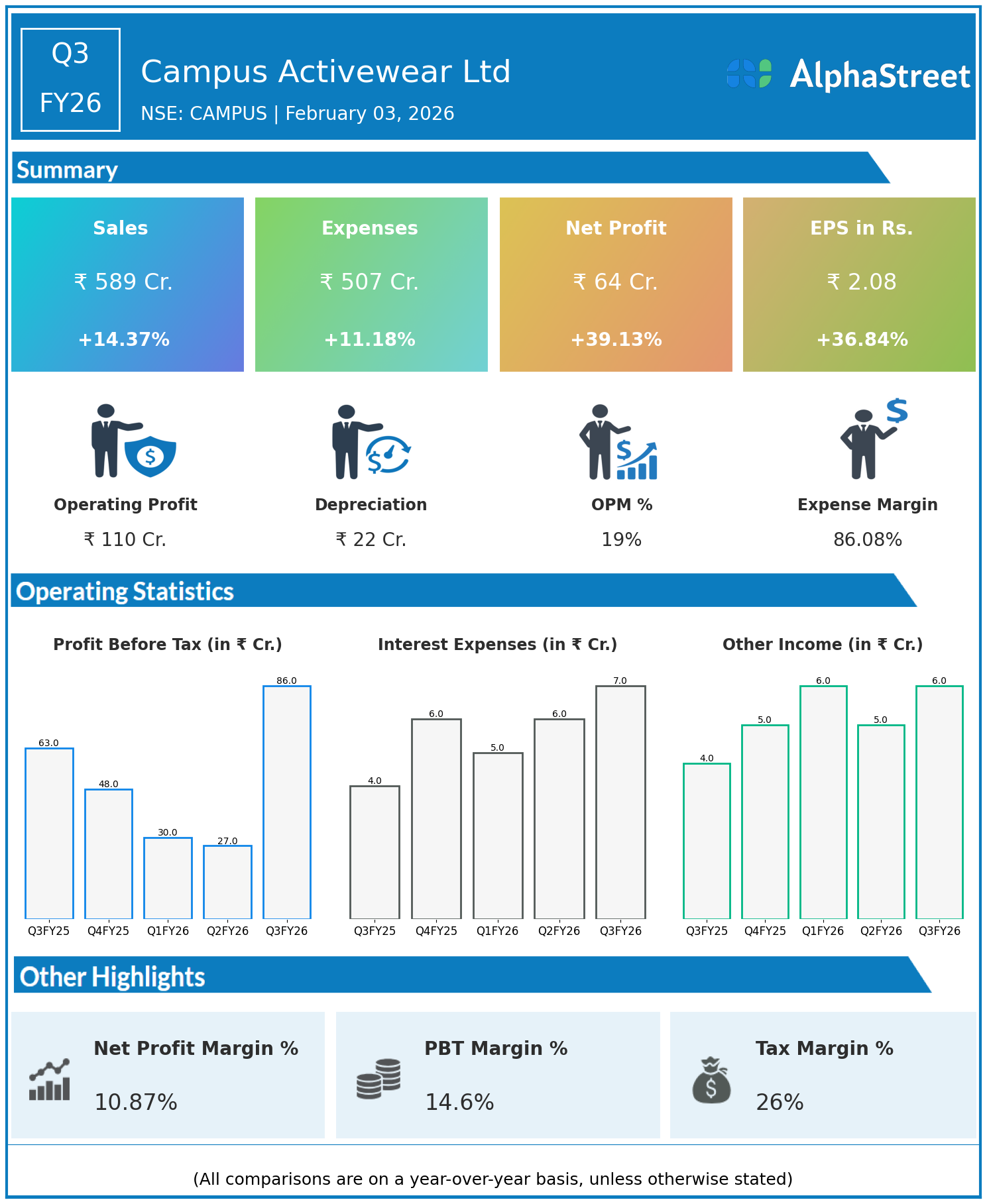 Campus Activewear Ltd reported Q3FY26 revenues of ₹589 crore, up 14.37% YoY, with consolidated net profit increasing 39.13% to ₹64 crore. Expense growth moderated to 11.18% YoY, delivering strong operating leverage in sports and athleisure footwear amid rising domestic fitness demand.