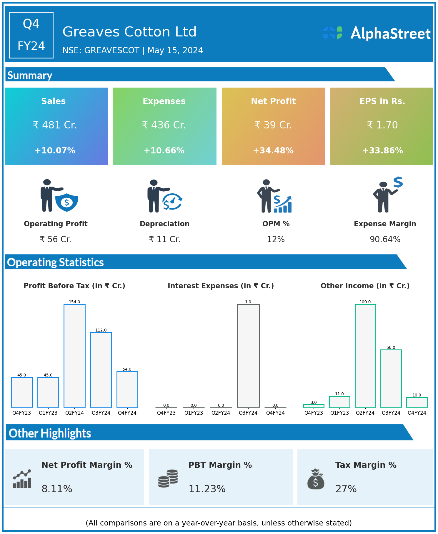 Greaves Cotton Ltd reported Revenues for Q4FY24 of ₹481.00 Crores up from ₹437.00 Crore year on year, a rise of 10.07%.