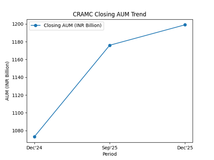 Canara Robeco Asset Management Company provides asset management services to schemes of Canara Robeco Mutual Fund and advisory services to clients. The company’s financial performance is largely driven by asset management fees and market-linked gains on investments. As of December 2025, the company reported assets under management (AUM) of ₹1,199 billion and quarterly average AUM (QAAUM) of ₹1,223 billion, with equity QAAUM of ₹1,106 billion.