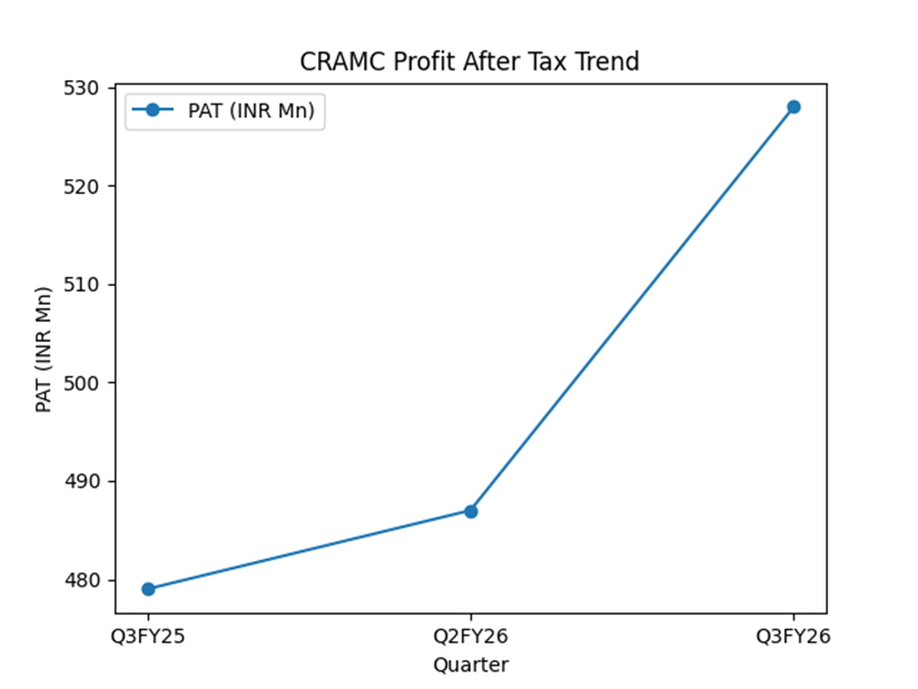 Canara Robeco Asset Management Company Ltd (BSE: 544580 / NSE: CRAMC) reported total income of ₹1,215 million and profit after tax of ₹528 million for the quarter ended December 2025, according to its Q3 FY26 investor presentation. Revenue from operations rose to ₹1,098 million from ₹960 million a year earlier, while profit after tax increased from ₹479 million in Q3 FY25. For the nine months ended December 2025, the company reported total income of ₹3,508 million and profit after tax of ₹1,624 million.