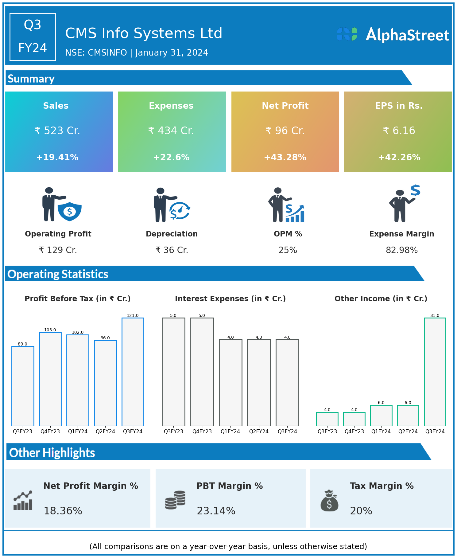 CMS Info Systems Ltd reported Revenues for Q3FY24 of ₹523.00 Crores up from ₹438.00 Crore year on year, a rise of 19.41%.