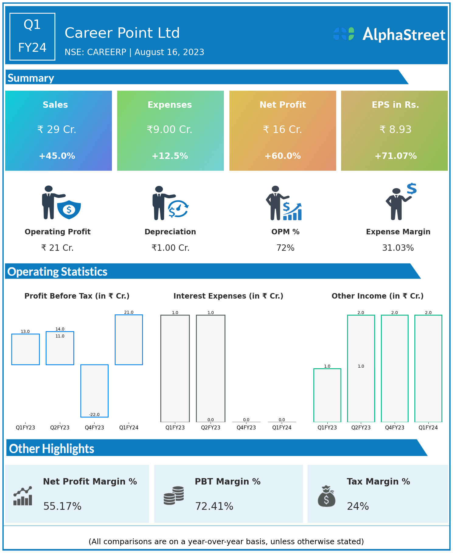 Career Point Ltd reported Revenues for Q1FY24 of ₹29.00 Crores up from ₹20.00 Crore year on year, a rise of 45.0%.