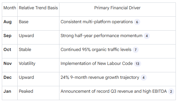 An area chart depicting a steady upward trajectory from August 2025 to January 2026. The x-axis is labeled by month. The chart reflects the company’s growth from ₹521.88 crores in the prior nine-month period to ₹649.02 crores in the current nine-month period, culminating in a peak following the January 28 record revenue announcement.