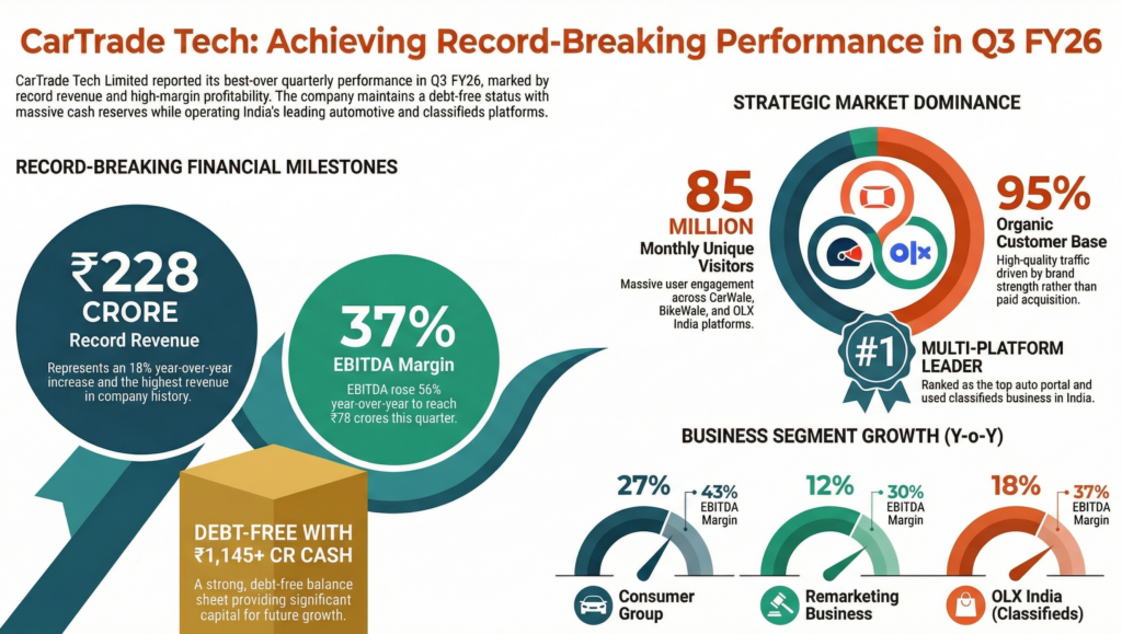 • “One Platform” Diversification: CarTrade Tech utilizes a single ecosystem to manage diversified, profitable segments including Consumer Group (CarWale, BikeWale), Remarketing (Shriram Automall), and Classifieds (OLX India). This multi-channel approach allows for structural margin expansion across the board.