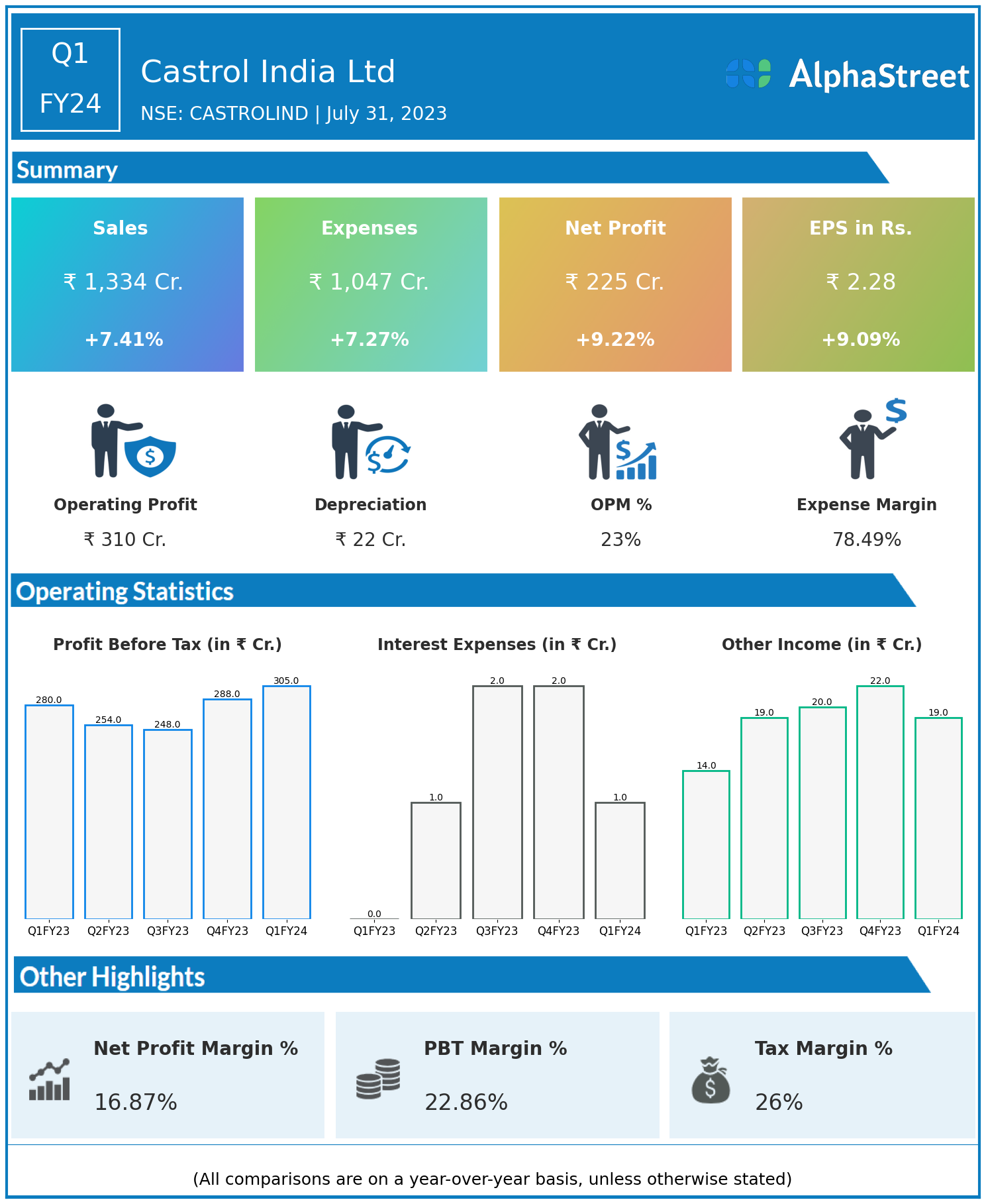 Castrol India Ltd reported Revenues for Q1FY24 of ₹1,334.00 Crores up from ₹1,242.00 Crore year on year, a rise of 7.41%.