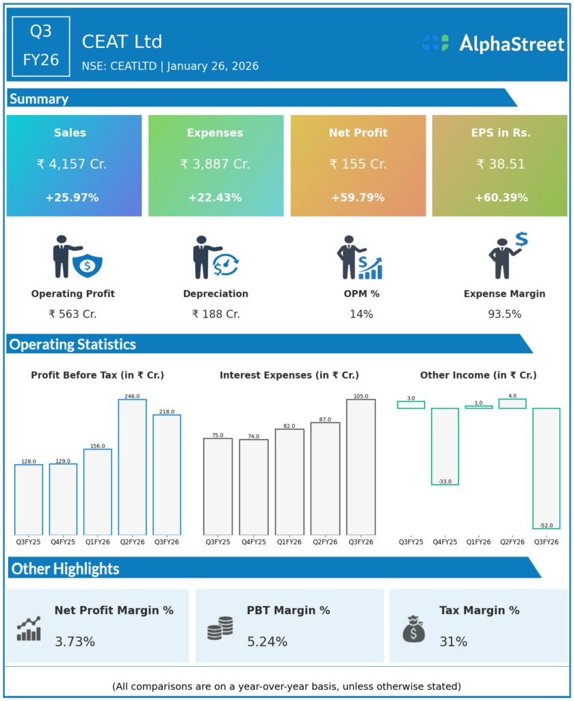 CEAT Ltd posted Q3FY26 revenues of ₹4,157 crore, up 25.97% YoY, with consolidated net profit leaping 59.79% to ₹155 crore. Total expenses rose 22.43% YoY to ₹3,887 crore, enabling robust profit growth.