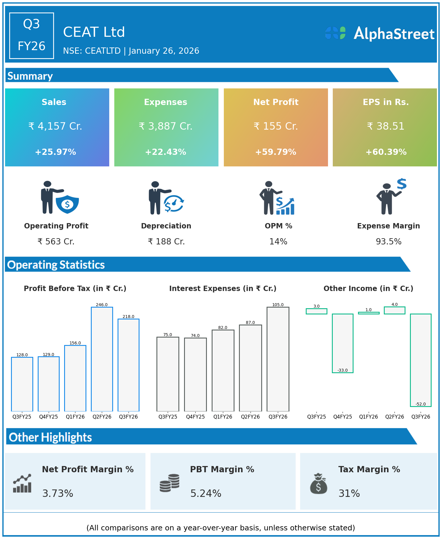 CEAT Ltd posted Q3FY26 revenues of ₹4,157 crore, up 25.97% YoY, with consolidated net profit leaping 59.79% to ₹155 crore. Total expenses rose 22.43% YoY to ₹3,887 crore, enabling robust profit growth.