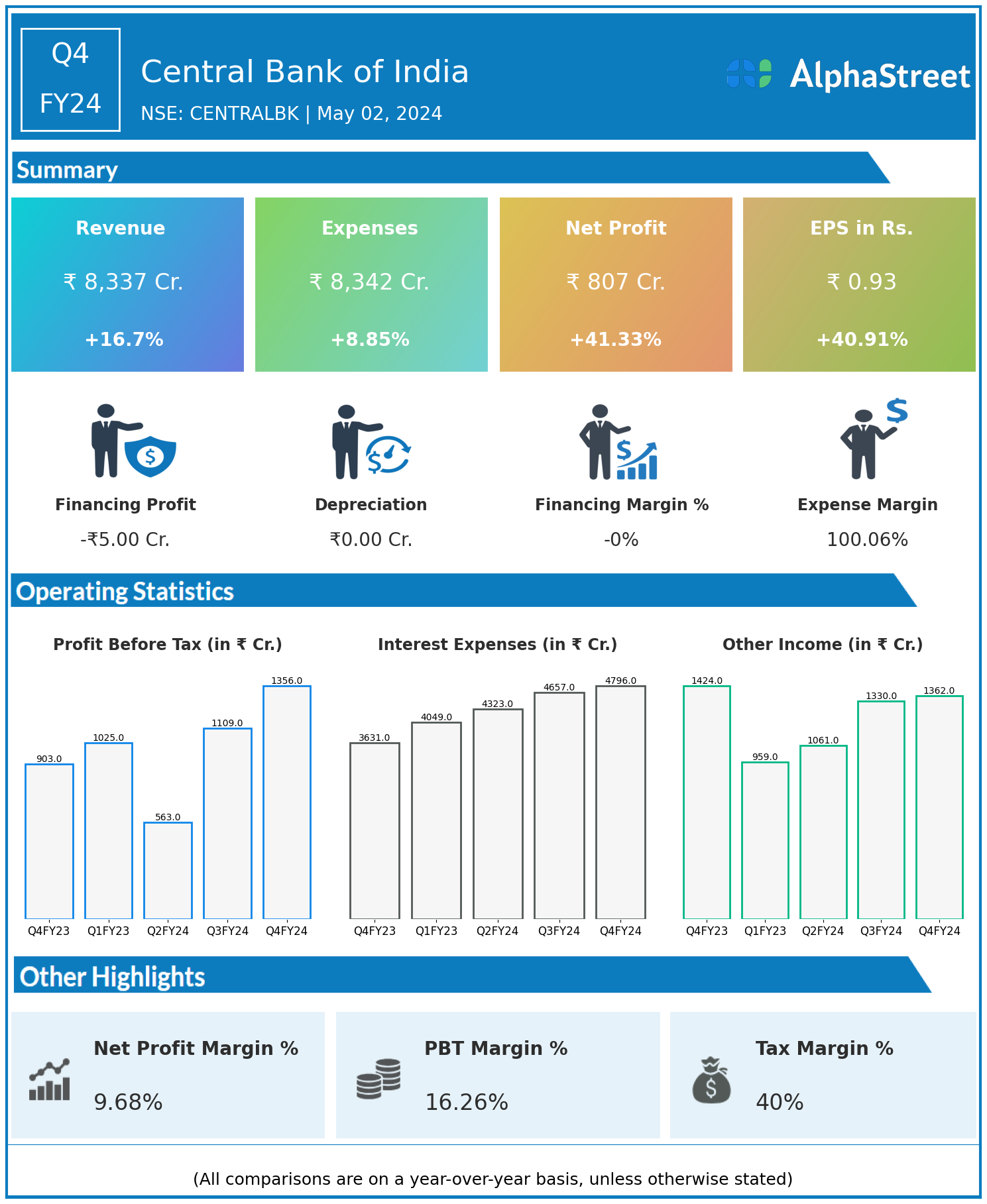 Central Bank of India reported Revenues for Q4FY24 of ₹8,337.00 Crores up from ₹7,144.00 Crore year on year, a rise of 16.7%.