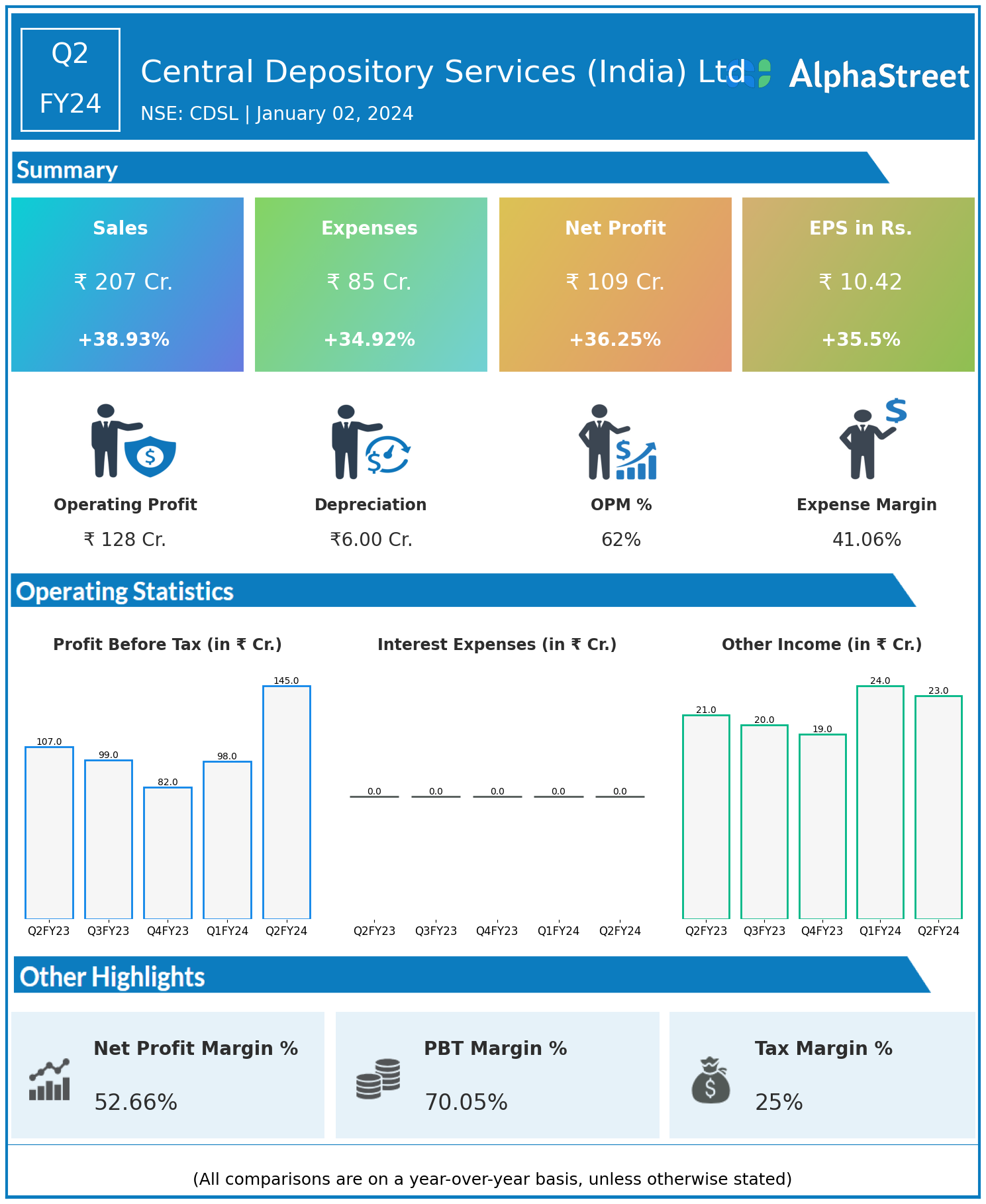 Central Depository Services (India) Ltd reported Revenues for Q2FY24 of ₹207.00 Crores up from ₹149.00 Crore year on year, a rise of 38.93%.