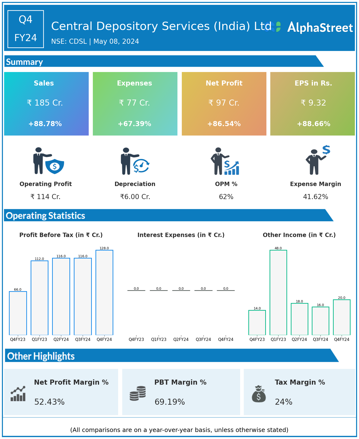 Central Depository Services (India) Ltd reported Revenues for Q4FY24 of ₹185.00 Crores up from ₹98.00 Crore year on year, a rise of 88.78%.