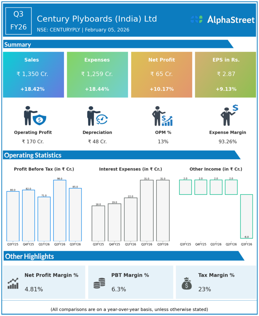 Century Plyboards India Ltd reported Q3FY26 revenues of ₹1,350 crore, up 18.42% YoY, with consolidated net profit increasing 10.17% to ₹65 crore. Plywood volumes grew 19% while EBITDA margins expanded 190 bps to 12.6%, driven by operational leverage despite ₹7.61 crore Labour Code exceptional charges.
