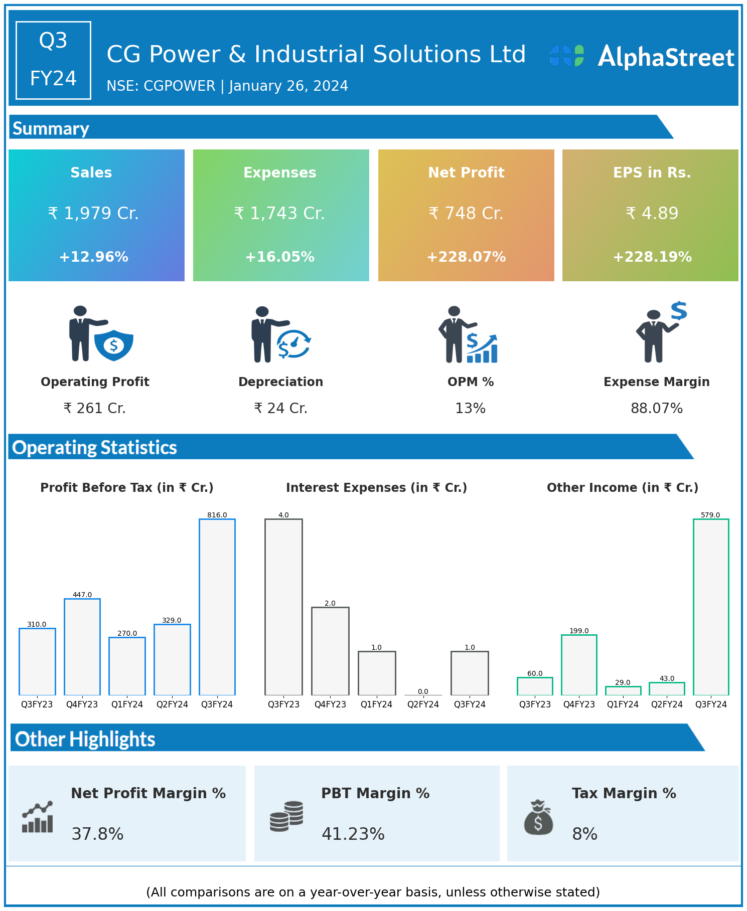 CG Power & Industrial Solutions Ltd reported Revenues for Q3FY24 of ₹1,979.00 Crores up from ₹1,752.00 Crore year on year, a rise of 12.96%.