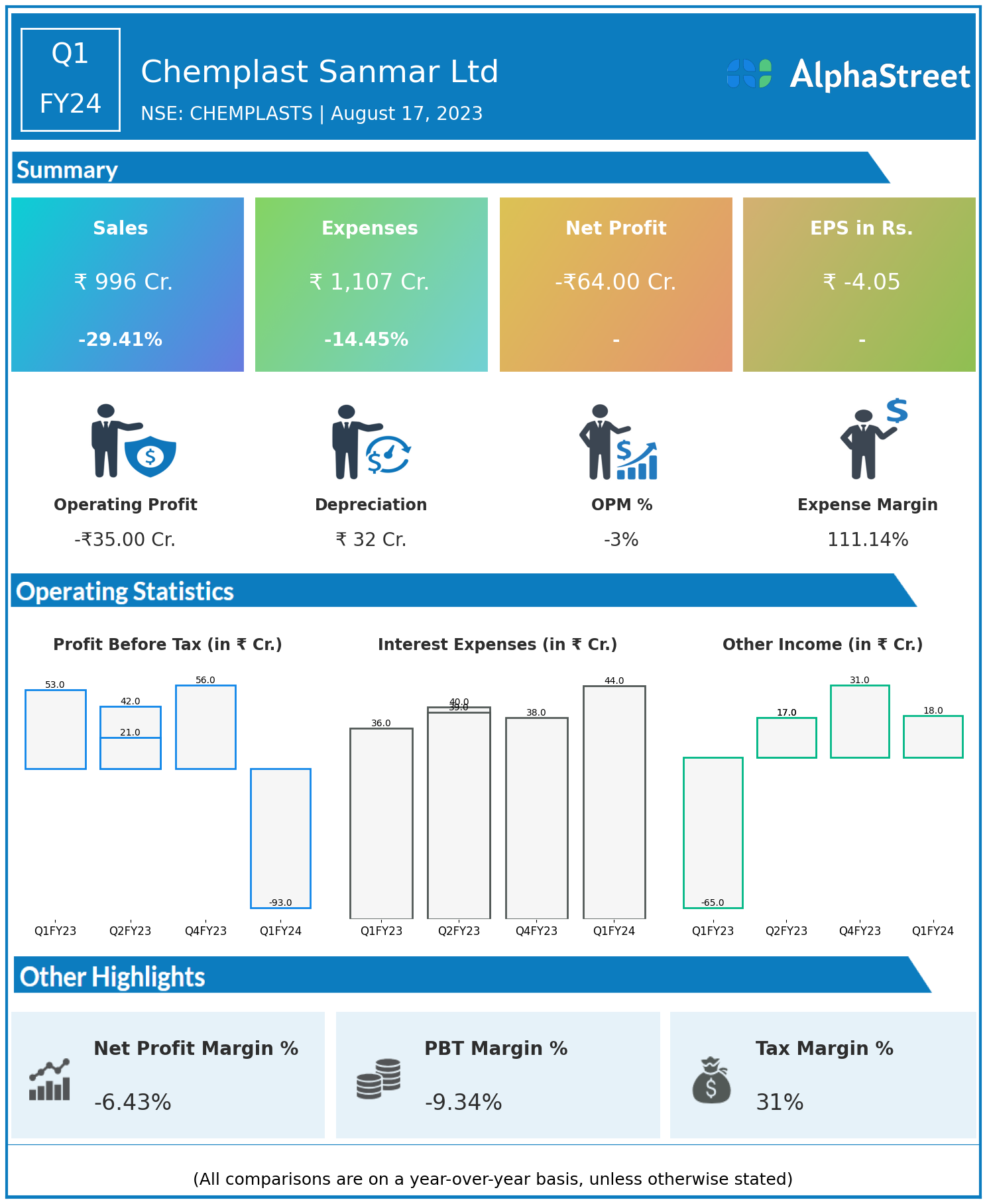 Chemplast Sanmar Ltd reported Revenues for Q1FY24 of ₹996.00 Crores down from ₹1,411.00 Crore year on year, a fall of 29.41%.