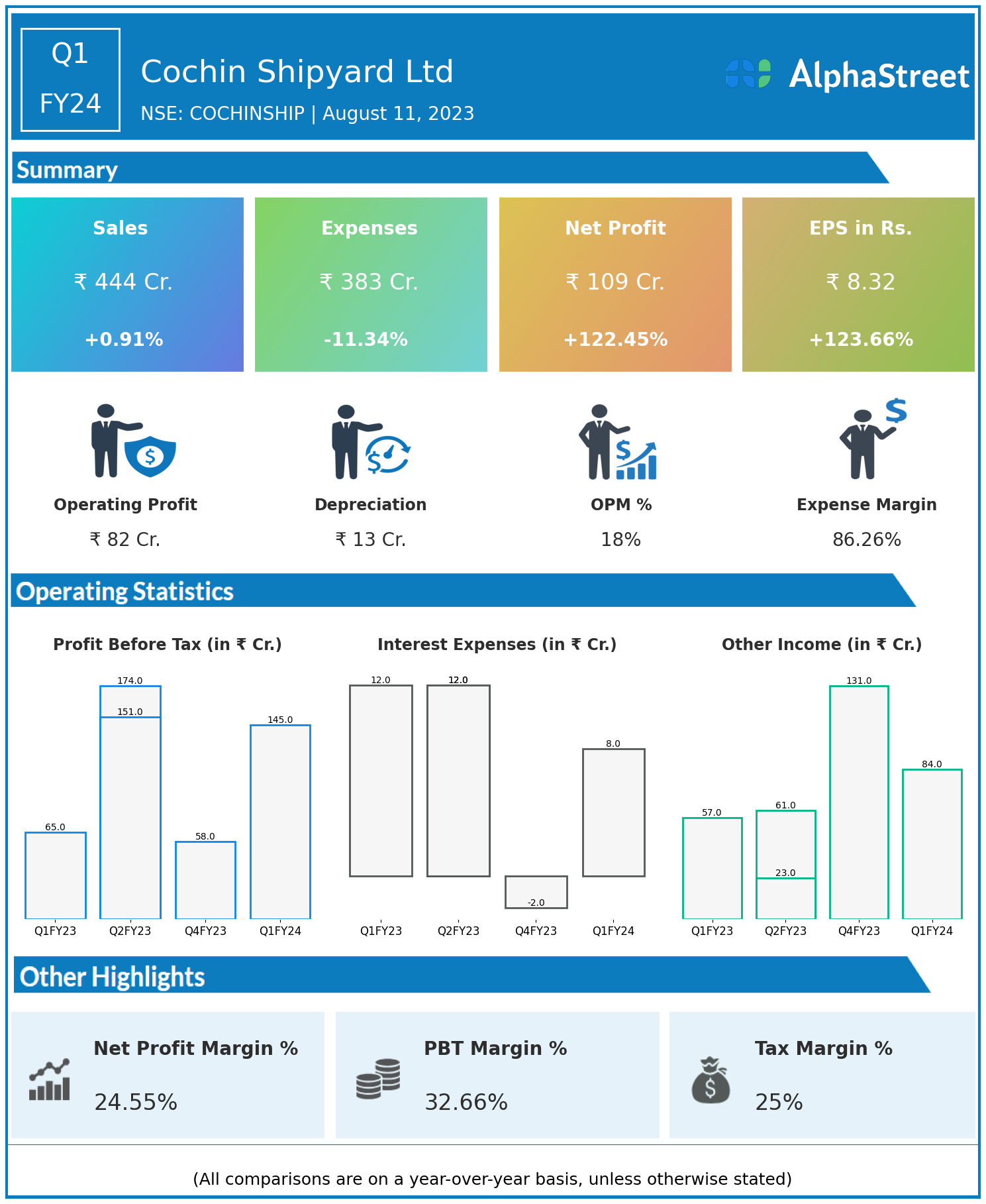 Cochin Shipyard Ltd reported Revenues for Q1FY24 of ₹444.00 Crores up from ₹440.00 Crore year on year, a rise of 0.91%.