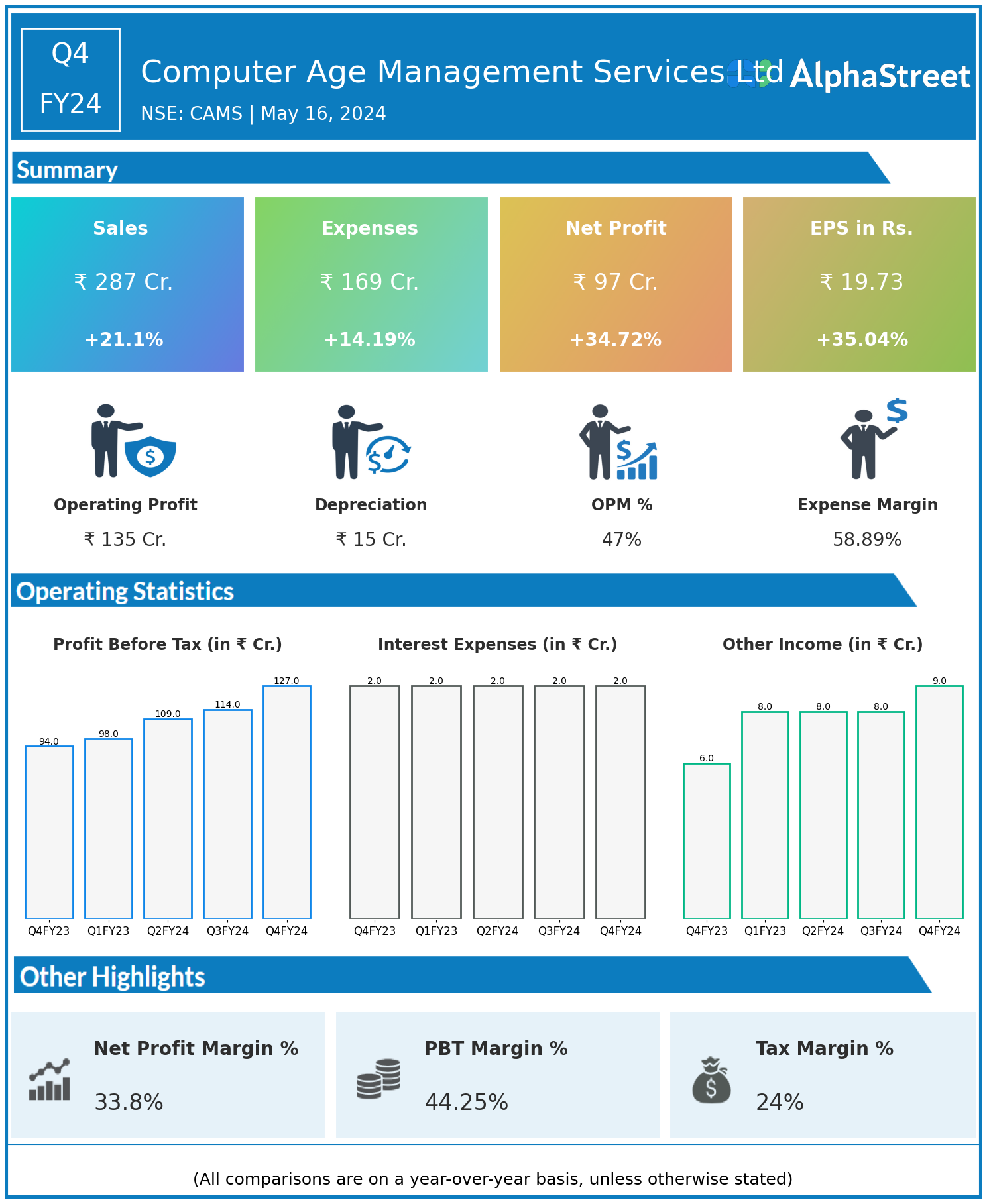 Computer Age Management Services Ltd reported Revenues for Q4FY24 of ₹287.00 Crores up from ₹237.00 Crore year on year, a rise of 21.1%.