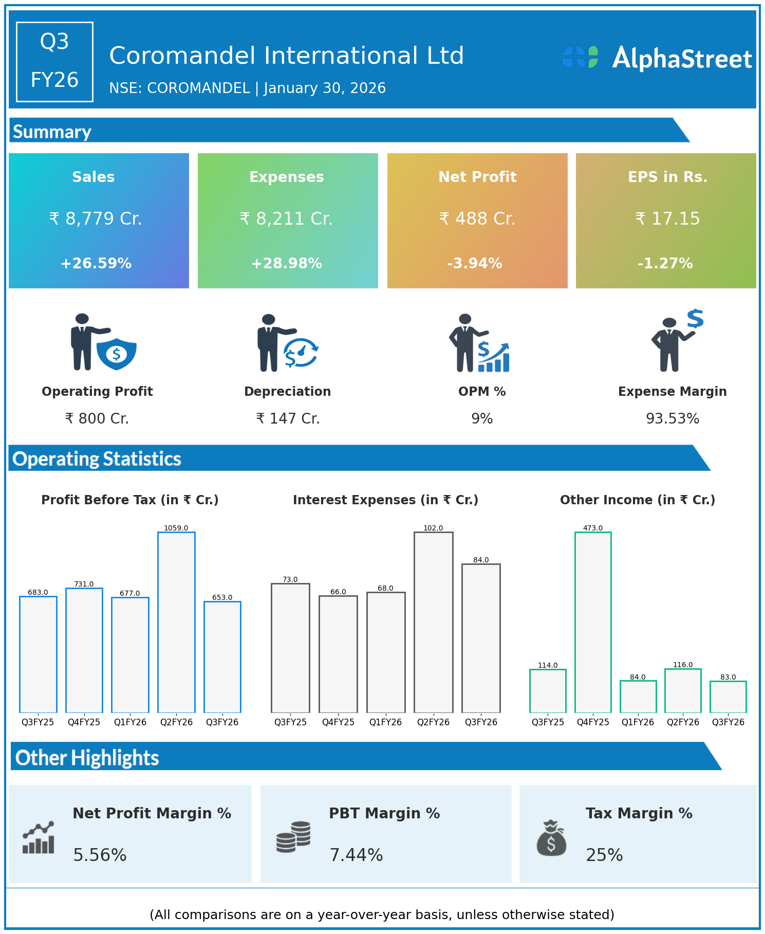 Coromandel International Ltd reported Q3FY26 revenues of ₹8,779 crore, up 26.59% YoY, but consolidated net profit declined 3.94% to ₹488 crore. Total expenses rose 28.98% YoY to ₹8,211 crore, reflecting cost pressures that offset strong volume-driven top-line growth.