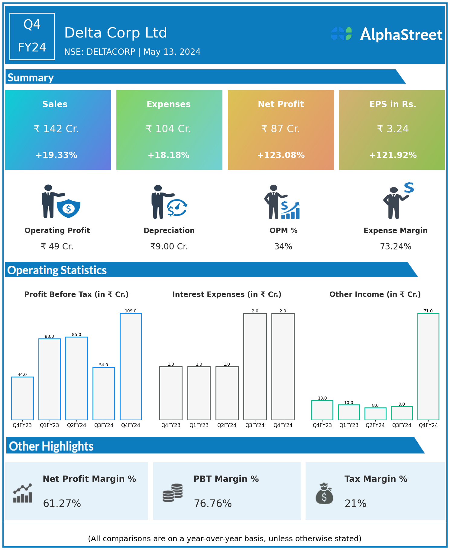 Delta Corp Ltd reported Revenues for Q4FY24 of ₹142.00 Crores up from ₹119.00 Crore year on year, a rise of 19.33%.