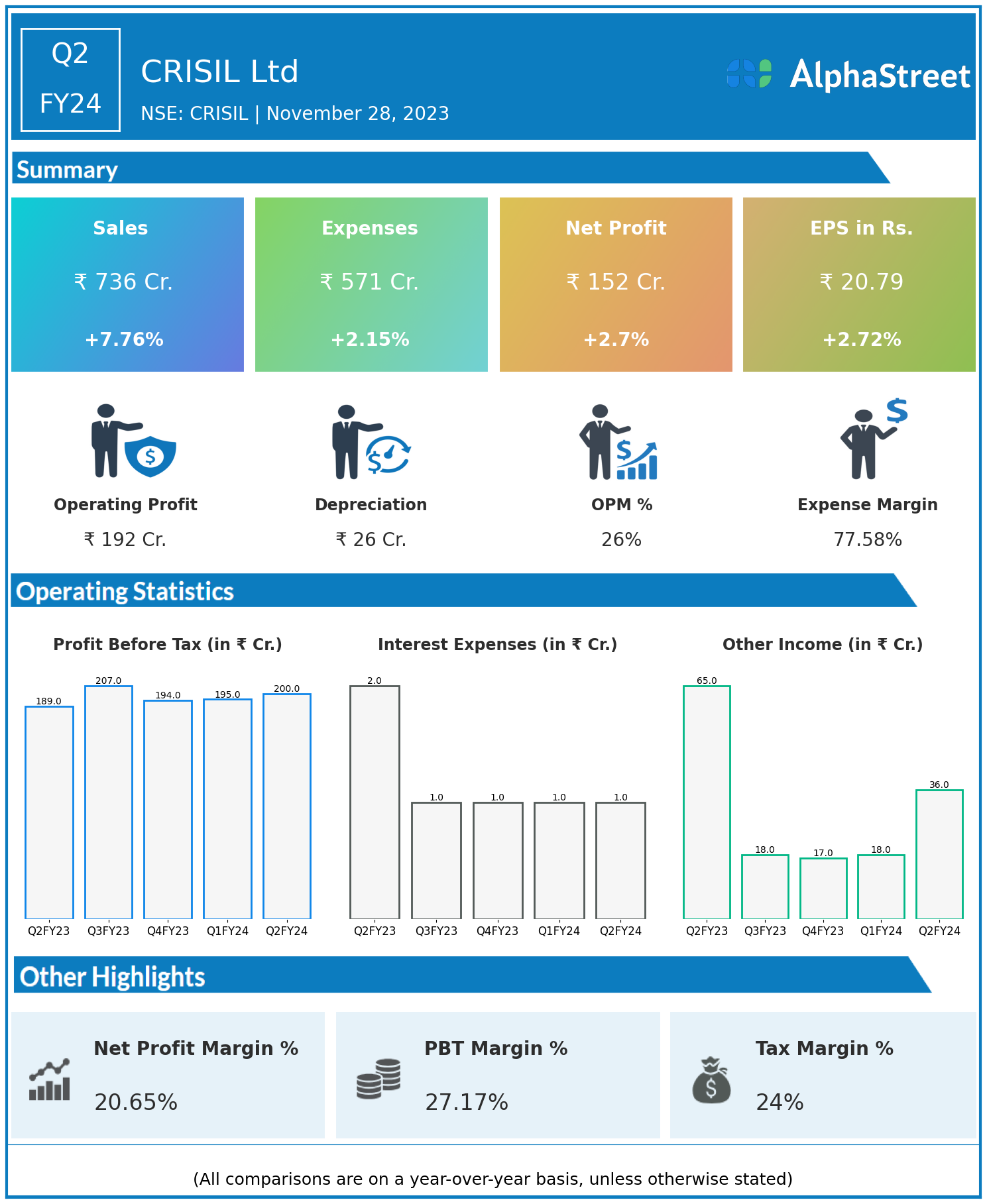 CRISIL Ltd reported Revenues for Q2FY24 of ₹736.00 Crores up from ₹683.00 Crore year on year, a rise of 7.76%.