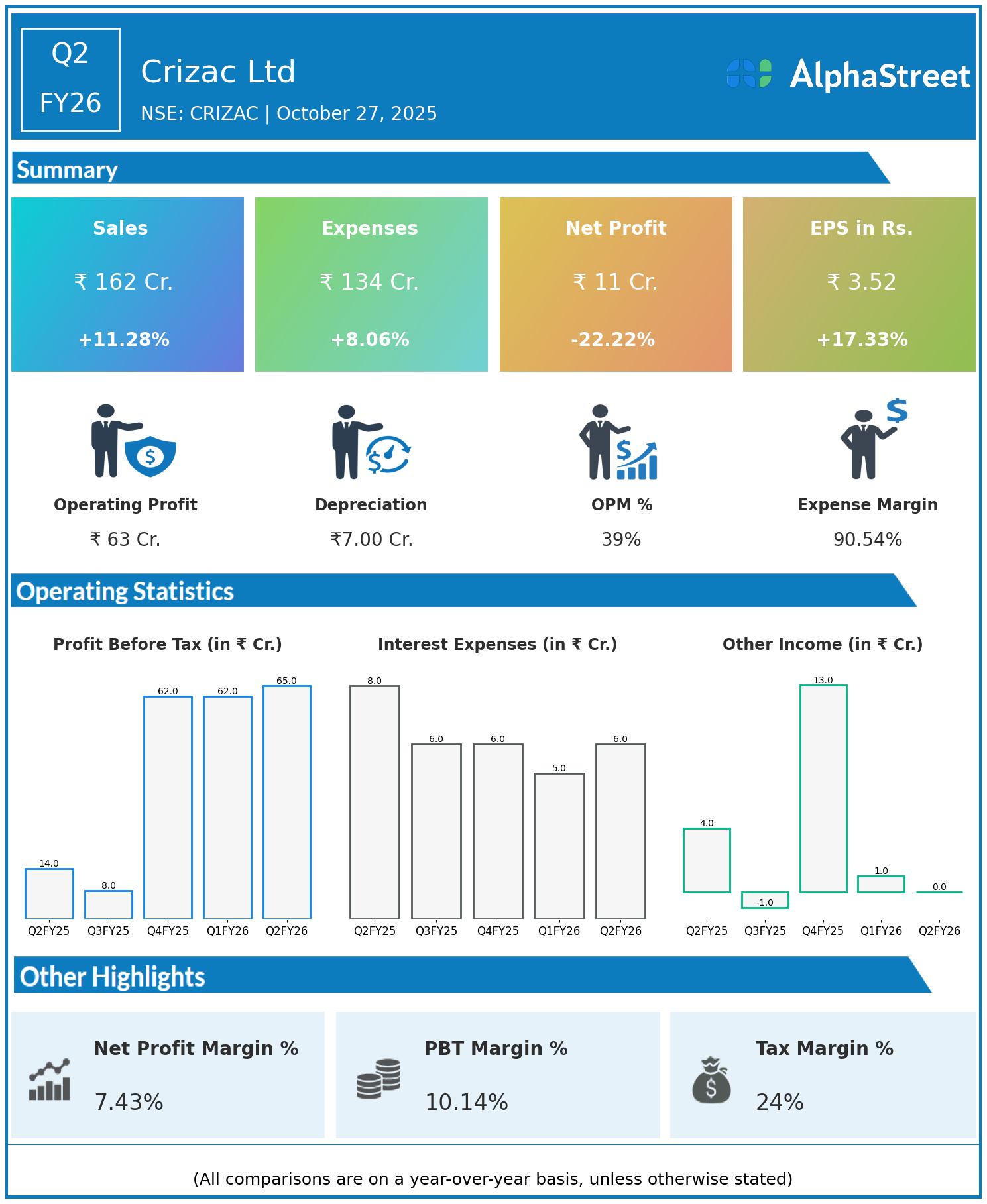 - Revenues rose 11.28% year on year to ₹162 crore, up from ₹130 crore in Q2 FY25.