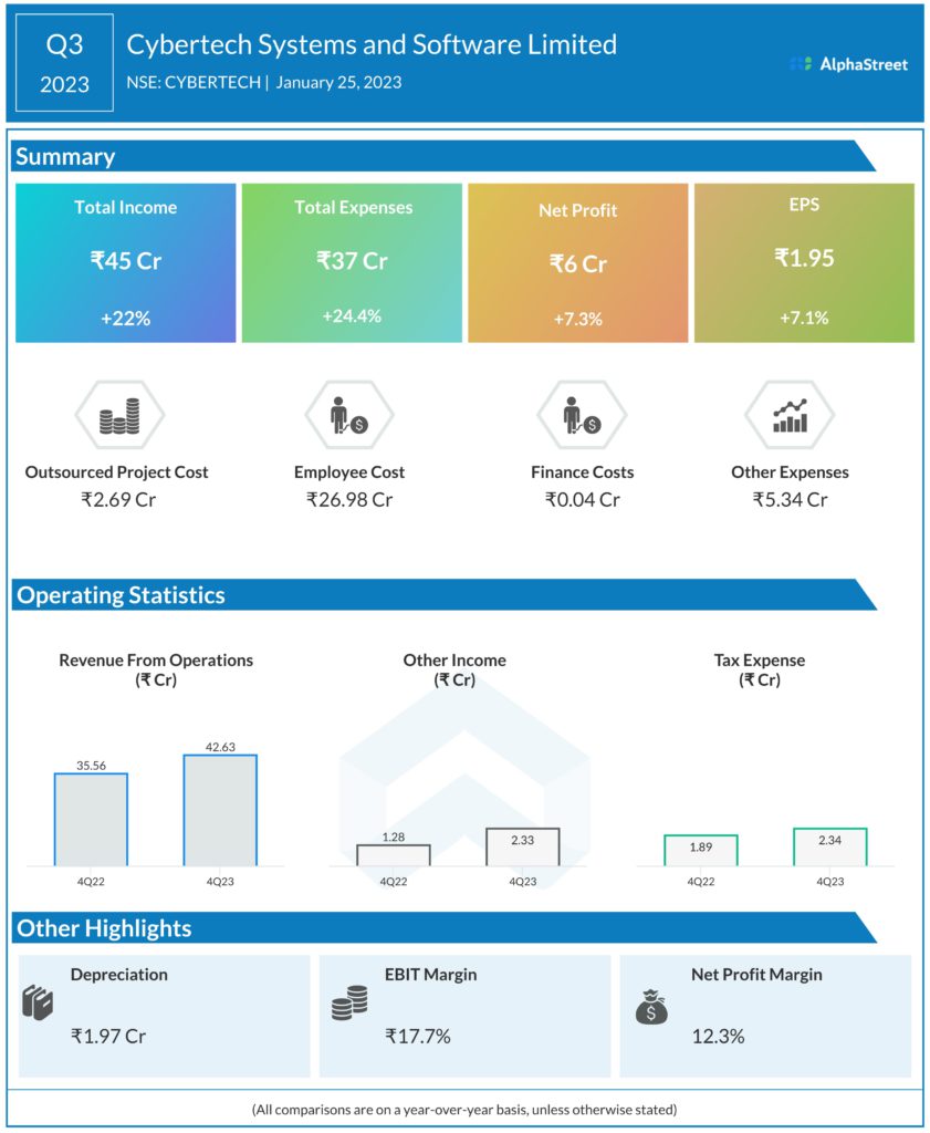 CyberTech Systems and Software Limited reported Total Income for Q3 FY23 of ₹44.96 Crore up from ₹36.84 Crore year on year, a growth of 22%. Consolidated Net Profit of ₹5.56 Crore, up 7.3% from ₹5.18 Crore in the same quarter of the previous year. The Earnings per Share is ₹1.95 in this quarter.