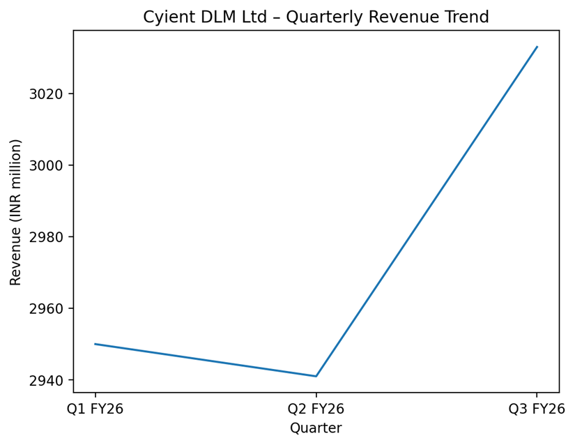 For the quarter ended December 31, 2025, Cyient DLM reported consolidated revenue from operations of ₹3,033.47 million, representing a year-on-year decline of about 31.7%. Consolidated net profit for the quarter was ₹112.33 million, up roughly 2% from the corresponding quarter of the previous year.