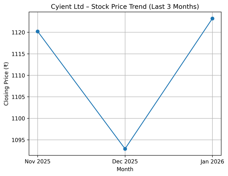 (Downloadable chart: Cyient Ltd stock price trend over the past three months with labelled axes and closing prices)