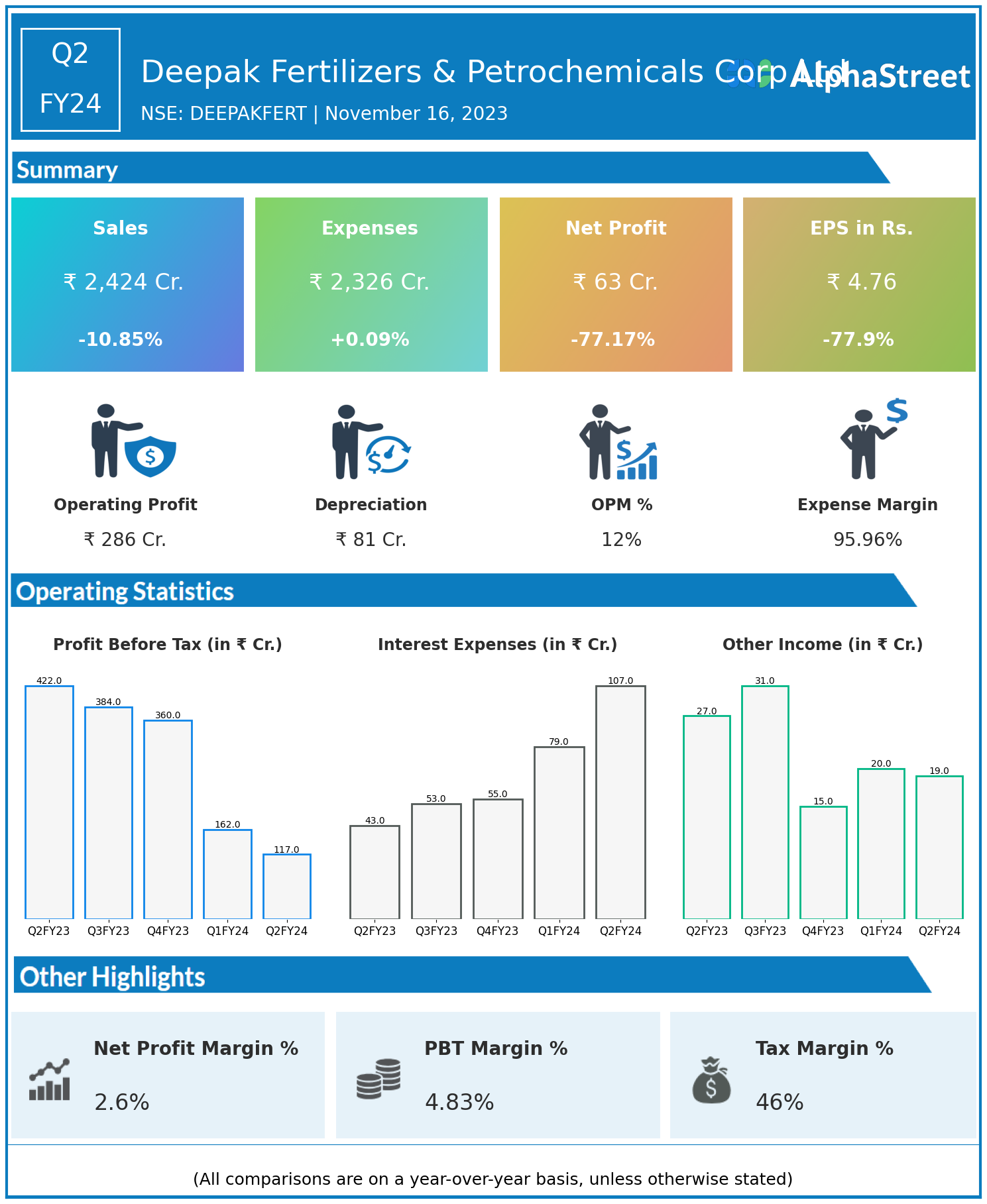 Deepak Fertilizers & Petrochemicals Corp Ltd reported Revenues for Q2FY24 of ₹2,424.00 Crores down from ₹2,719.00 Crore year on year, a fall of 10.85%.