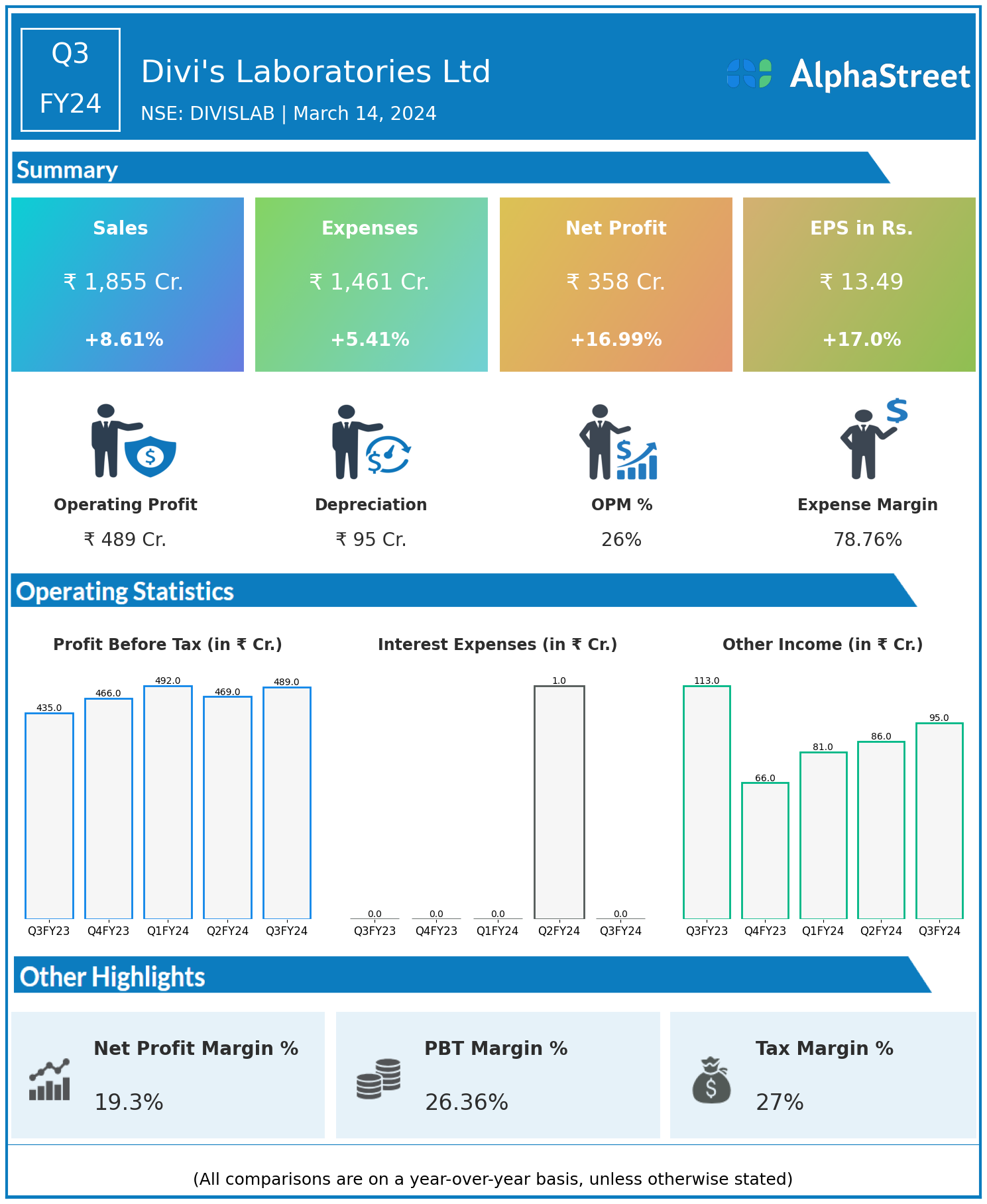 Divi’s Laboratories Ltd reported Revenues for Q3FY24 of ₹1,855.00 Crores up from ₹1,708.00 Crore year on year, a rise of 8.61%.