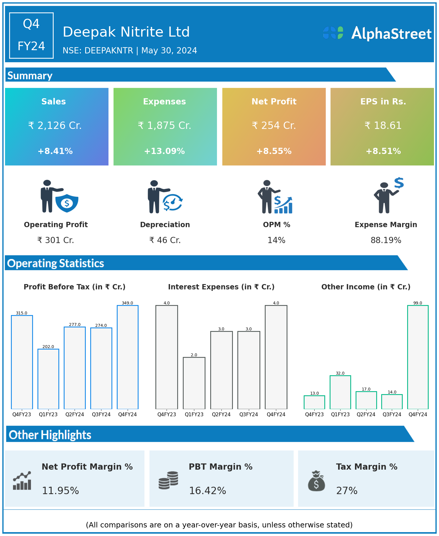 Deepak Nitrite Ltd reported Revenues for Q4FY24 of ₹2,126.00 Crores up from ₹1,961.00 Crore year on year, a rise of 8.41%.