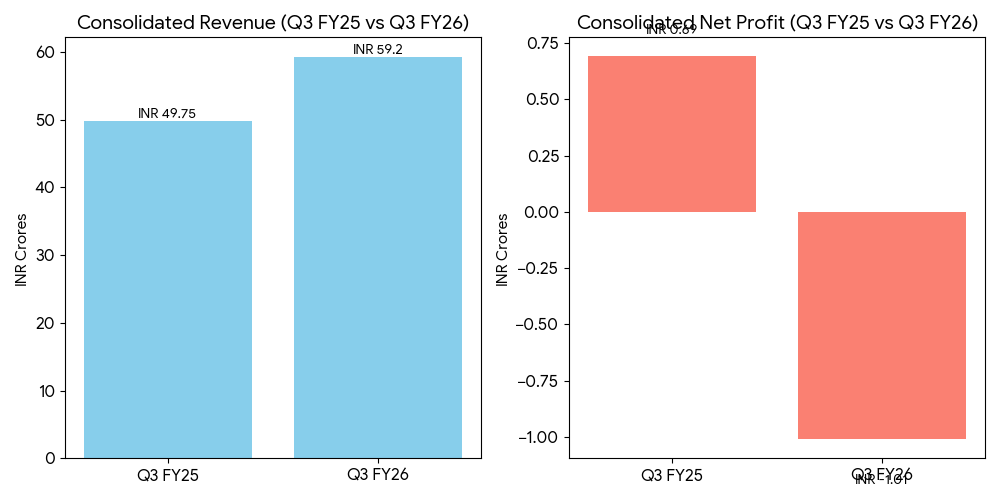 For the quarter ended December 31, 2025, Dev Accelerator Ltd reported consolidated revenue from operations of INR 59.20 crore, a 19.00% increase compared to INR 49.75 crore in the same period of the previous year. The company recorded a consolidated net loss of INR 1.01 crore for the quarter, compared to a net profit of INR 0.69 crore in the quarter ended December 31, 2024.