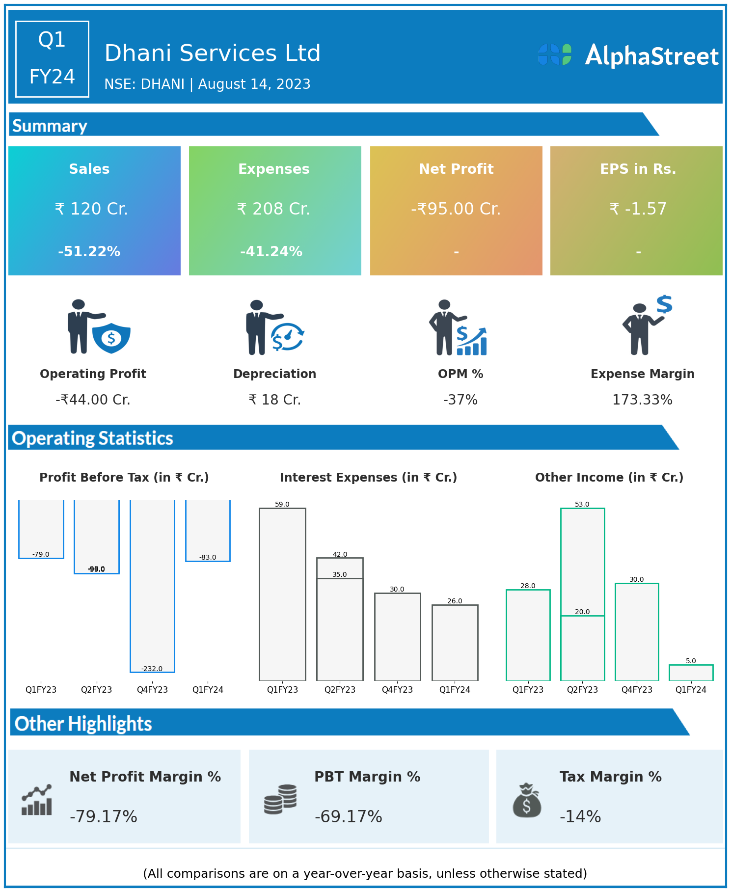 Total Expenses for Q1FY24 of ₹208.00 Crores down from ₹354.00 Crores year on year, a fall of 41.24%.