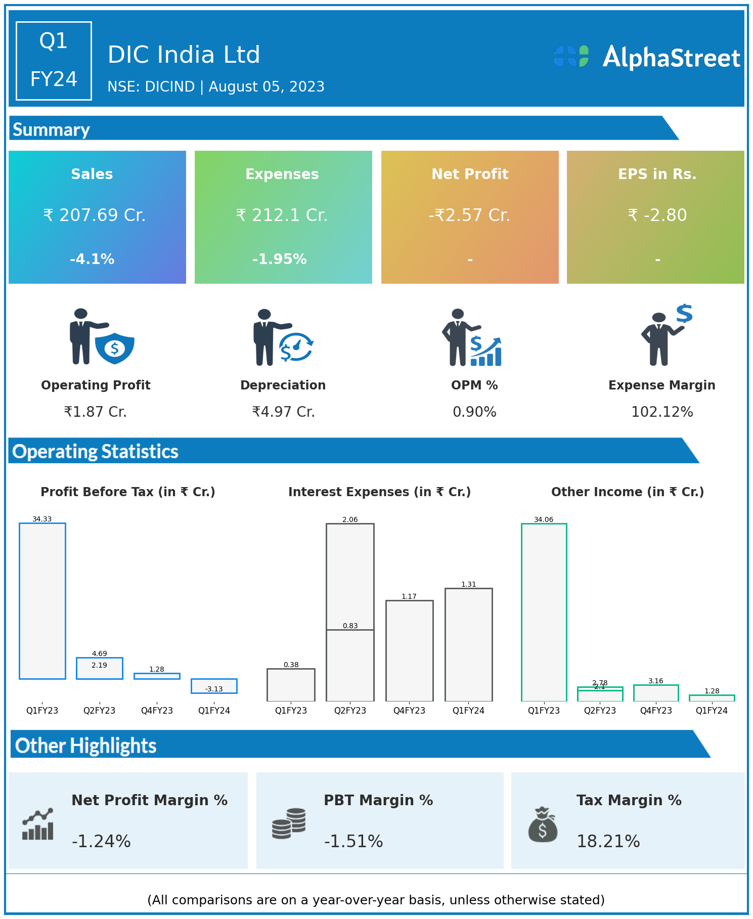 DIC India Ltd reported Revenues for Q1FY24 of ₹207.69 Crores down from ₹216.58 Crore year on year, a fall of 4.1%.