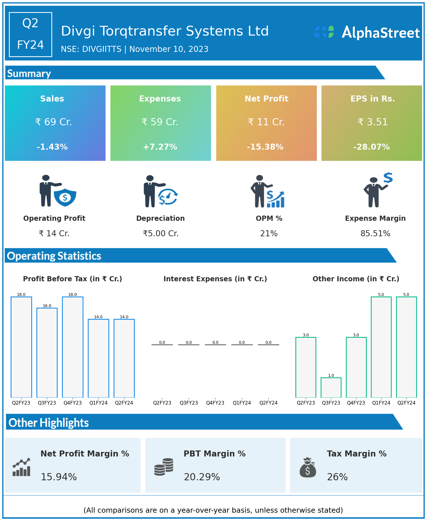 Divgi Torqtransfer Systems Ltd reported Revenues for Q2FY24 of ₹69.00 Crores down from ₹70.00 Crore year on year, a fall of 1.43%.
