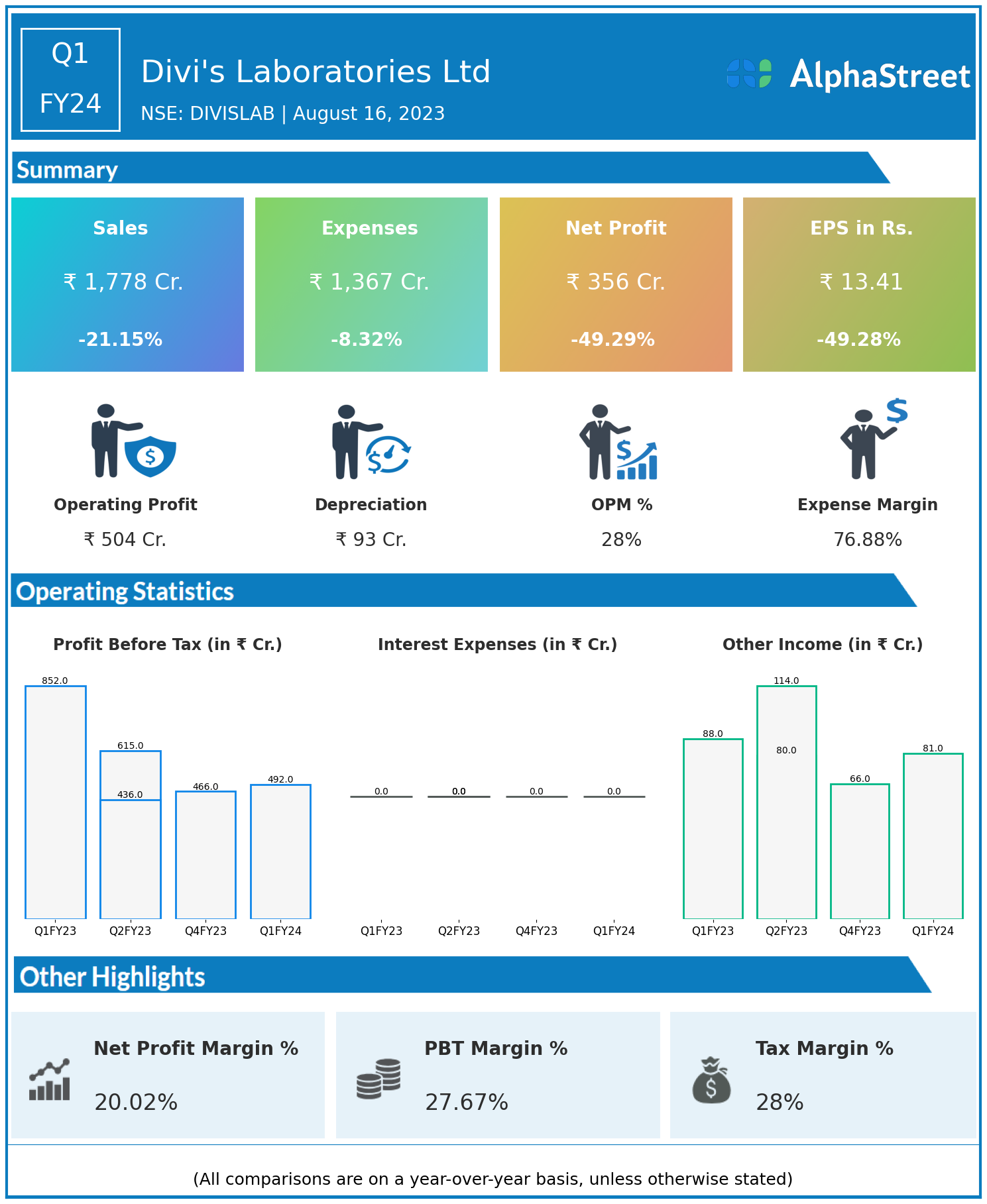 Divi’s Laboratories Ltd reported Revenues for Q1FY24 of ₹1,778.00 Crores down from ₹2,255.00 Crore year on year, a fall of 21.15%.