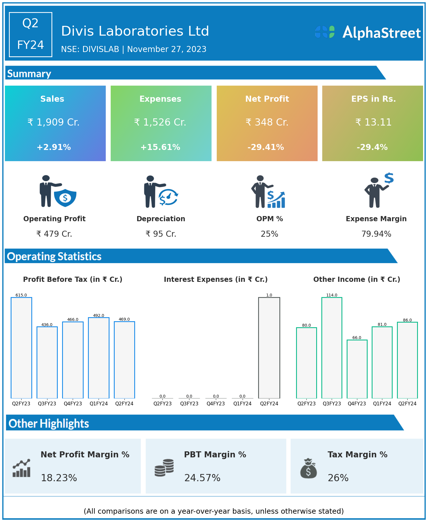 Divis Laboratories Ltd reported Revenues for Q2FY24 of ₹1,909.00 Crores up from ₹1,855.00 Crore year on year, a rise of 2.91%.
