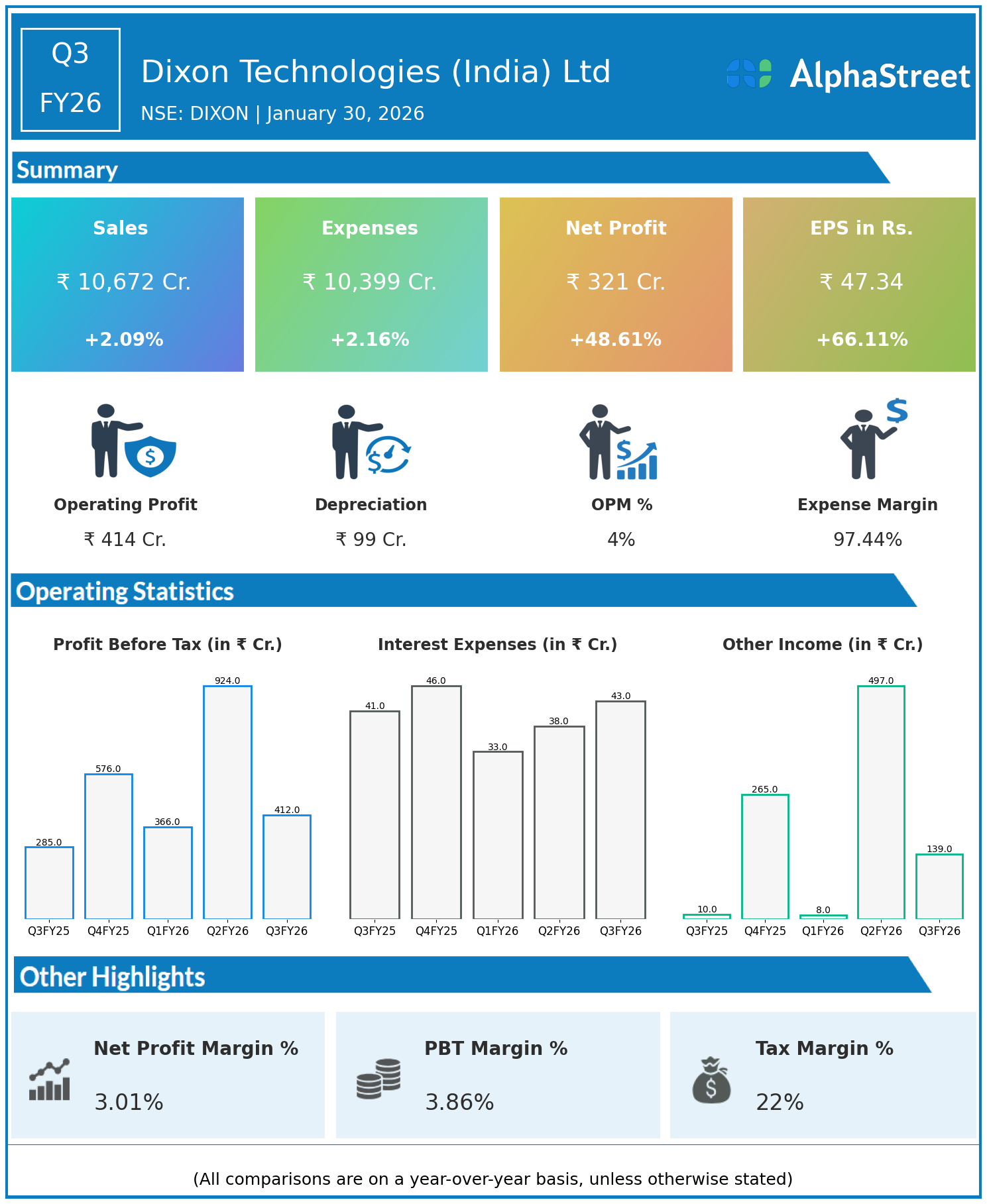 Dixon Technologies (India) Ltd reported Q3FY26 revenues of ₹10,672 crore, up 2.09% YoY, with consolidated net profit rising 48.61% to ₹321 crore. Total expenses increased 2.16% YoY to ₹10,399 crore, demonstrating strong margin improvement in electronics manufacturing.