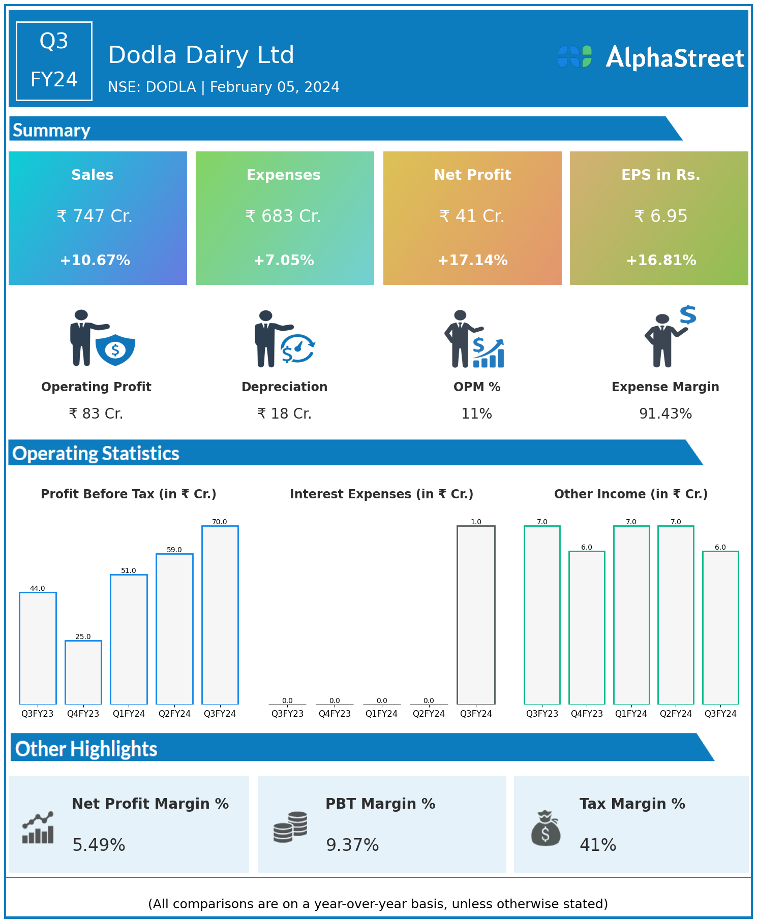 Dodla Dairy Ltd reported Revenues for Q3FY24 of ₹747.00 Crores up from ₹675.00 Crore year on year, a rise of 10.67%.