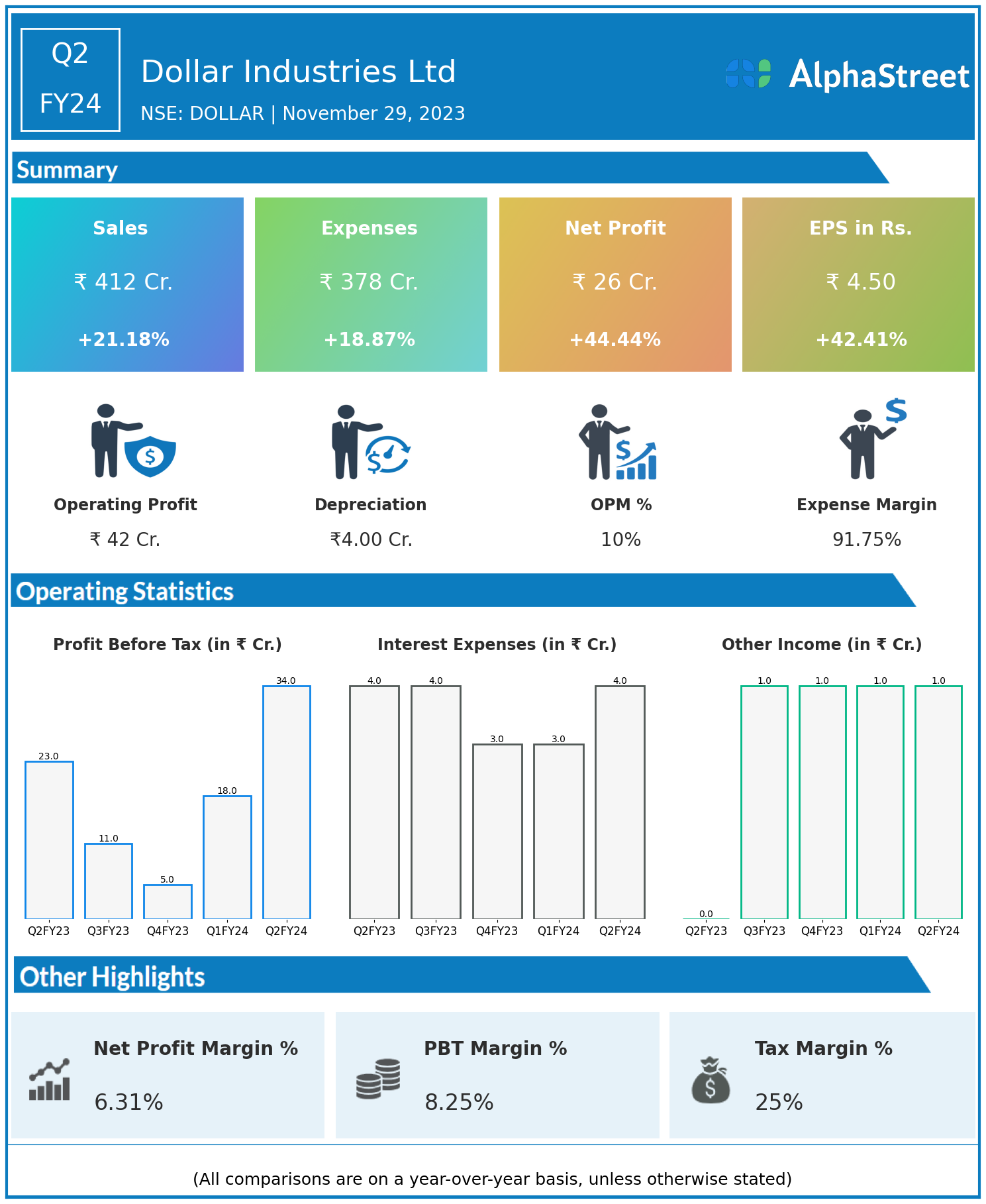 Dollar Industries Ltd reported Revenues for Q2FY24 of ₹412.00 Crores up from ₹340.00 Crore year on year, a rise of 21.18%.
